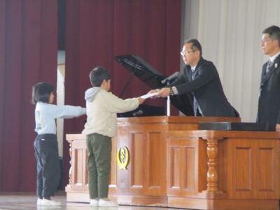 修了証書と 祝い品が 手渡されます