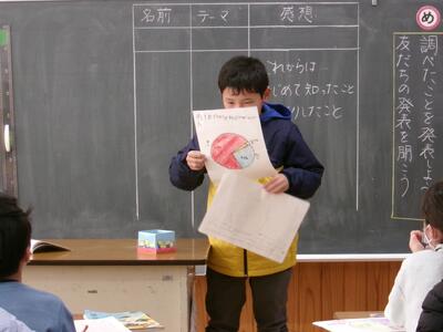 ひろげて つないで 投稿: HP担当 (02/26) 4年生 国語科「調べて話そう、生活調査隊」 自分が調べたことを… 資料を工夫して 作って わかりやすく 伝えたい 聞きたい 学びの広がり しろやまタイムで 鍛えたチカラ 「詩をよみあおう」 読んで感じたことを 伝え合い… また 新しい気付きが 次の感情へ 創作へ 言葉のつながりって 楽しい。 Tweet -