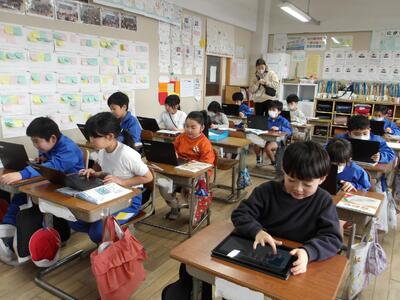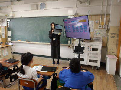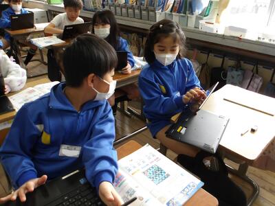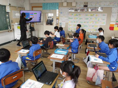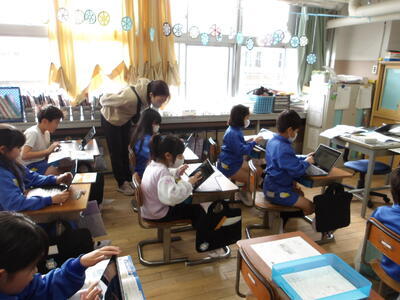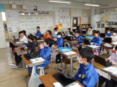 レポーターの5年生と カメラチームが 各教室を訪問